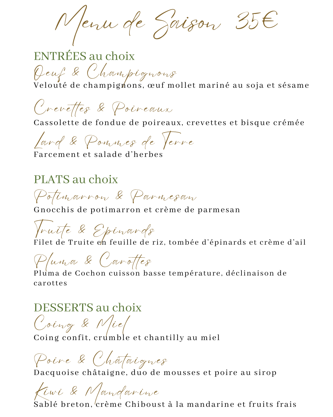Et tous les jours d’ouverture, dégustez notre Menu de Saison, doté de 3 propositions par plat. Les saveurs de Saison seront à l’honneur !
