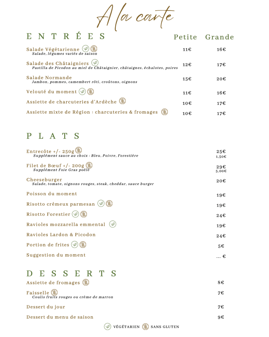 A la carte, vous trouverez une déclinaison de plus de 20 propositions, avec notamment des plats végétariens.